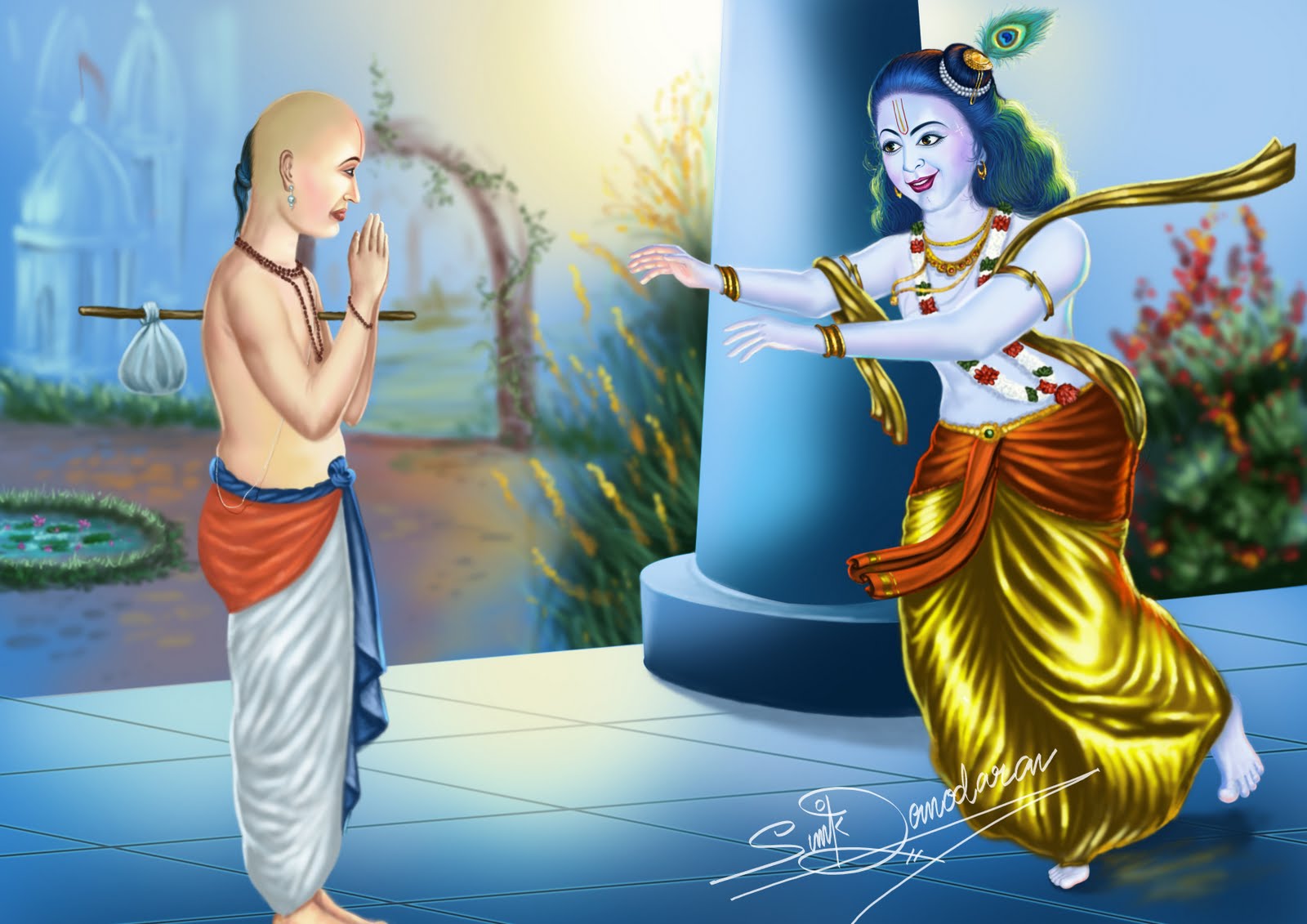 PS Изображение явно не соответствует надписи на изображении. Ибо Судама - это друг Кришны Васудевы и пришёл к к нему в гости. Наверное, это кто-то из так из украинских гаудия-вайшнавов постарался, что к надписи подобрал явно не ту картинку.